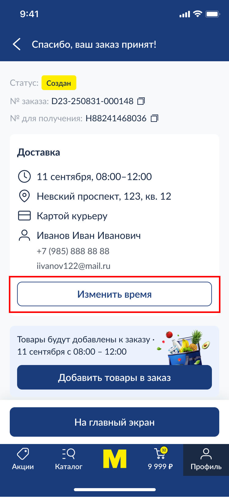 Откройте экран активного заказа и нажмите на кнопку «Изменить время» — вы сможете выбрать новый удобный интервал доставки (пример интерфейса — на скриншоте ниже/справа).